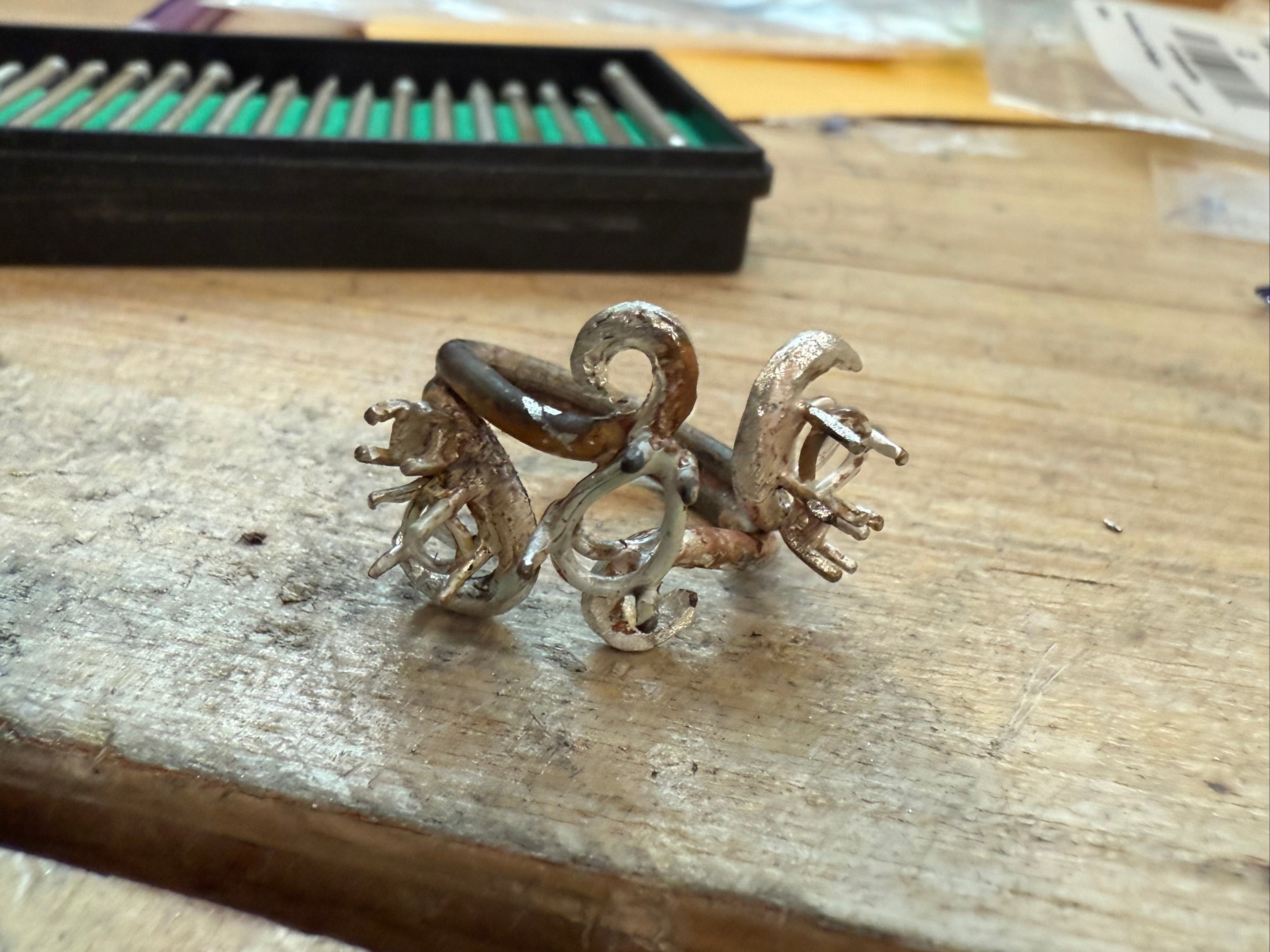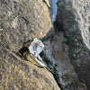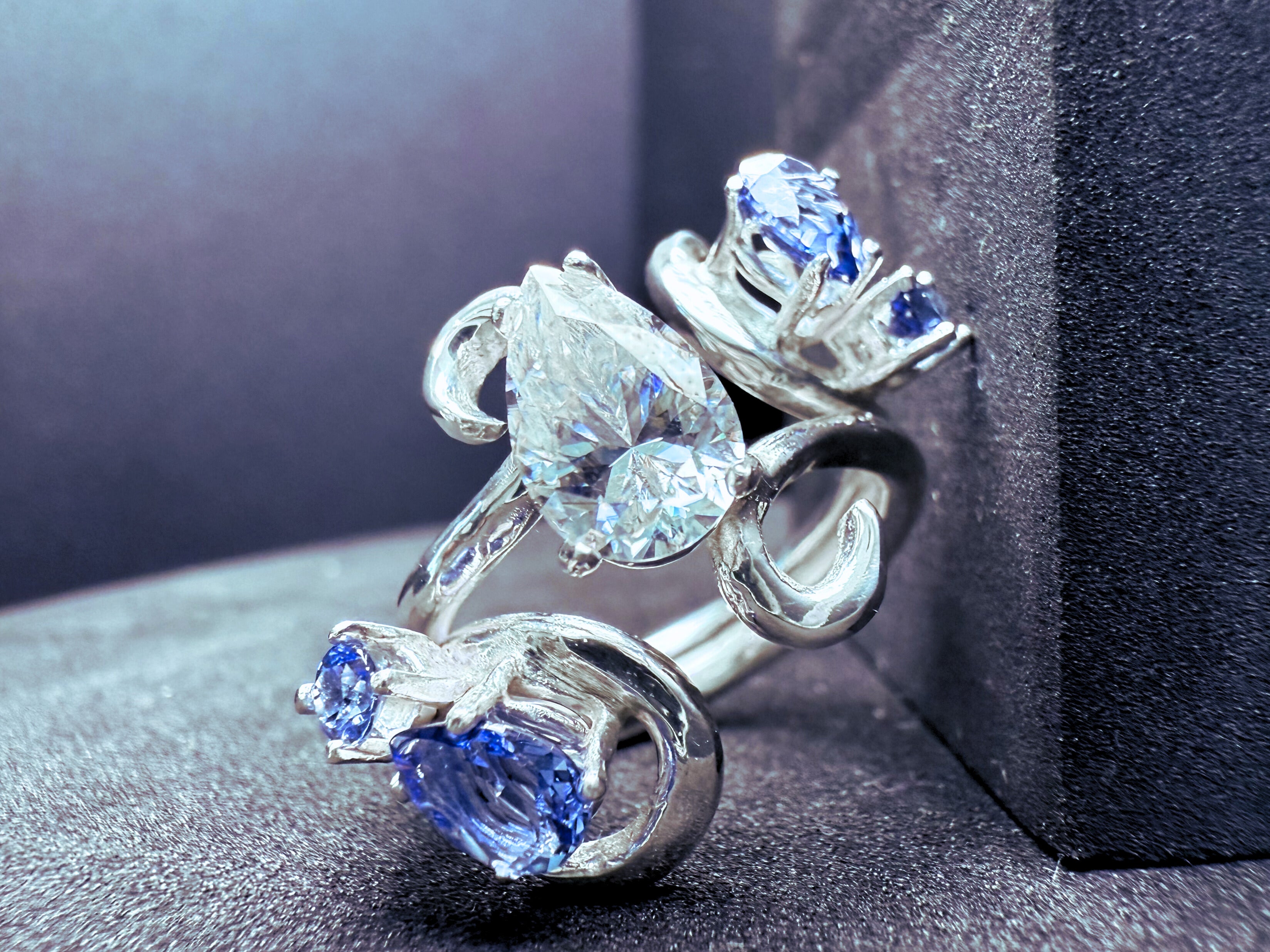 A sterling silver ring featuring a moissanite center and two blue sapphires — this piece was created as a design prototype to help a client visualize a future engagement ring. Inspired by the couple’s deep connection to the ocean, this design reimagines the classic engagement ring with a fresh, symbolic twist.The final version evolved for daily wear, but this mockup showcases the collaborative creativity and meaning behind every custom project.